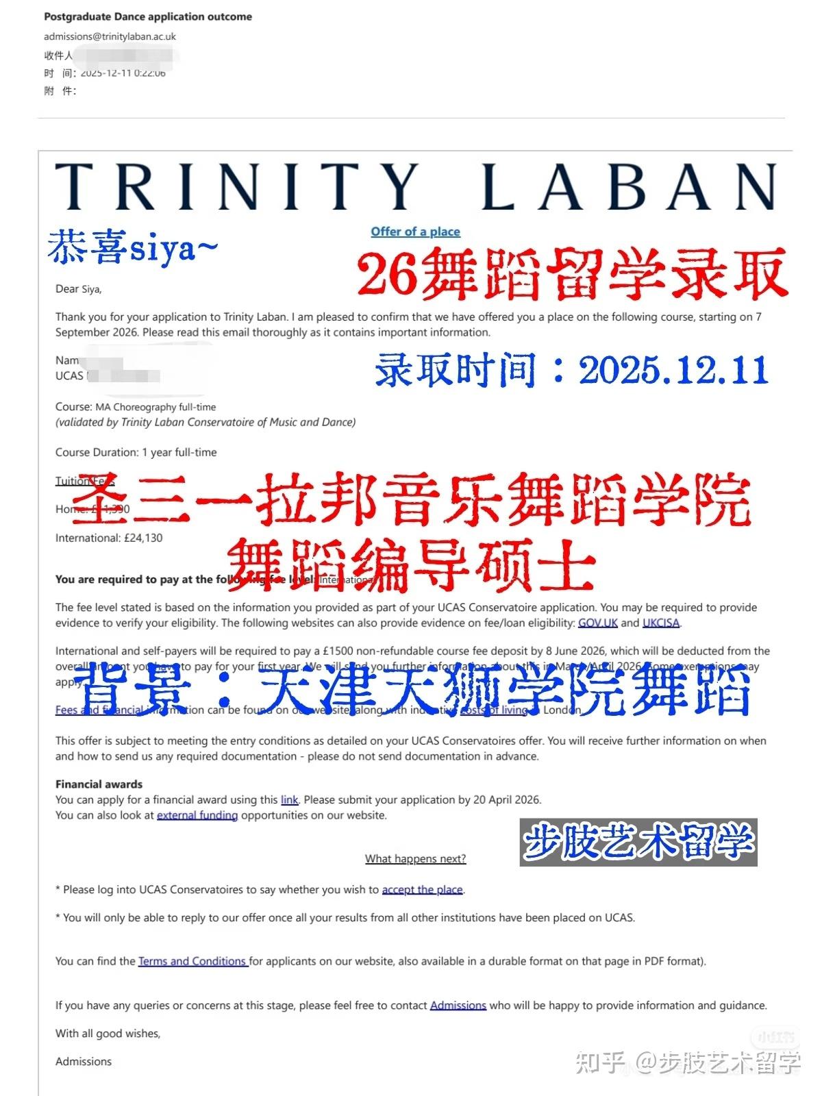 舞蹈硕士录取:天狮到圣三一的跨越 offer时间:2025.12.11 院校专业:圣三一拉邦音乐舞蹈学院舞蹈硕士 学员背景:天津天狮学院舞蹈