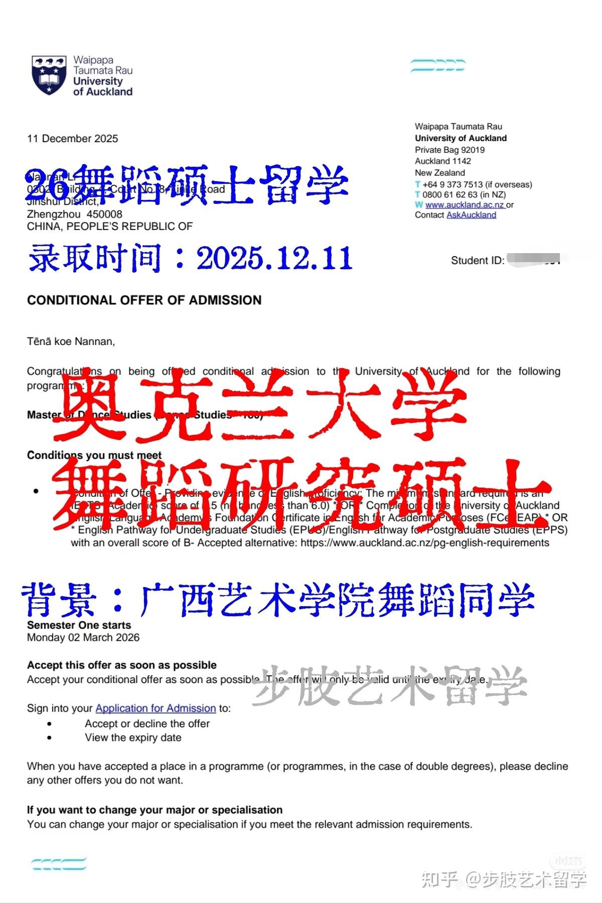 offer时间:2025.12.11 院校专业:奥克兰大学舞蹈研究硕士 学员北京:广西艺术学院舞蹈同学