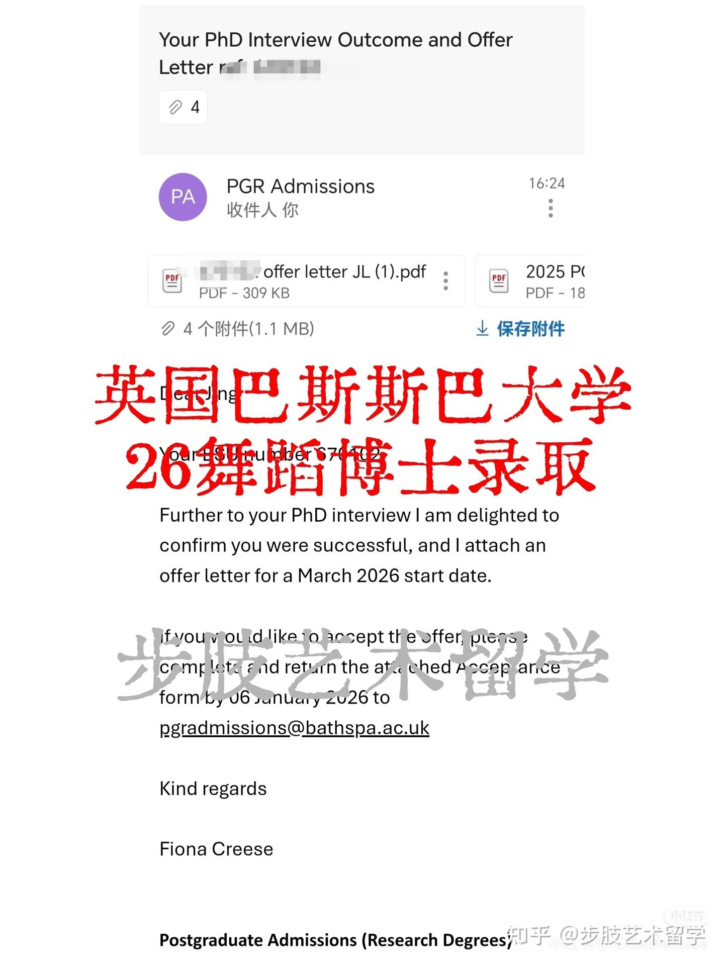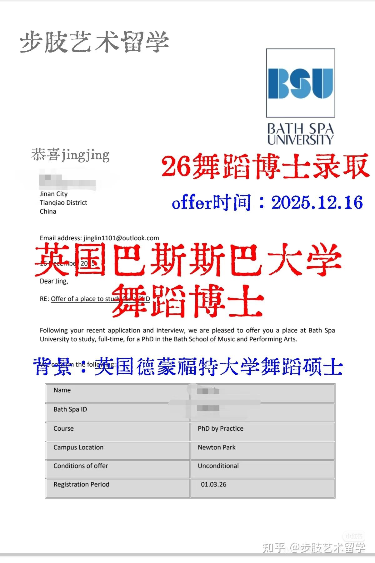 【步肢】舞蹈博士offer:英国名校录取 offer时间:2025.12.16 院校专业:英国巴斯斯巴大学舞蹈博士 学员背景:英国德蒙福特大学舞蹈硕士