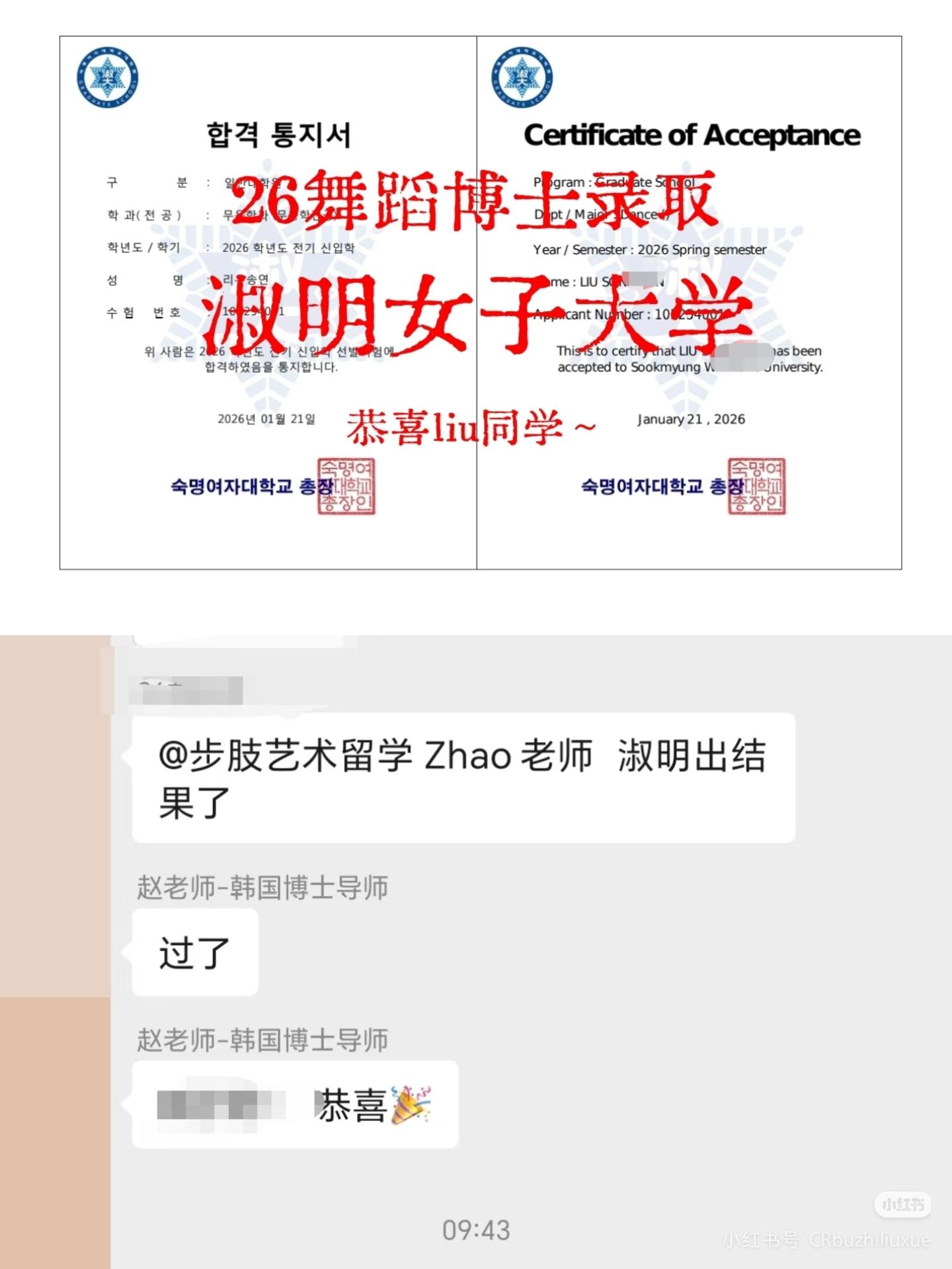 【步肢offer】26韩国淑明女子大学舞蹈博士 offer时间:2026.1.21 院校专业:韩国淑明女子大学舞蹈博士 恭喜liu同学