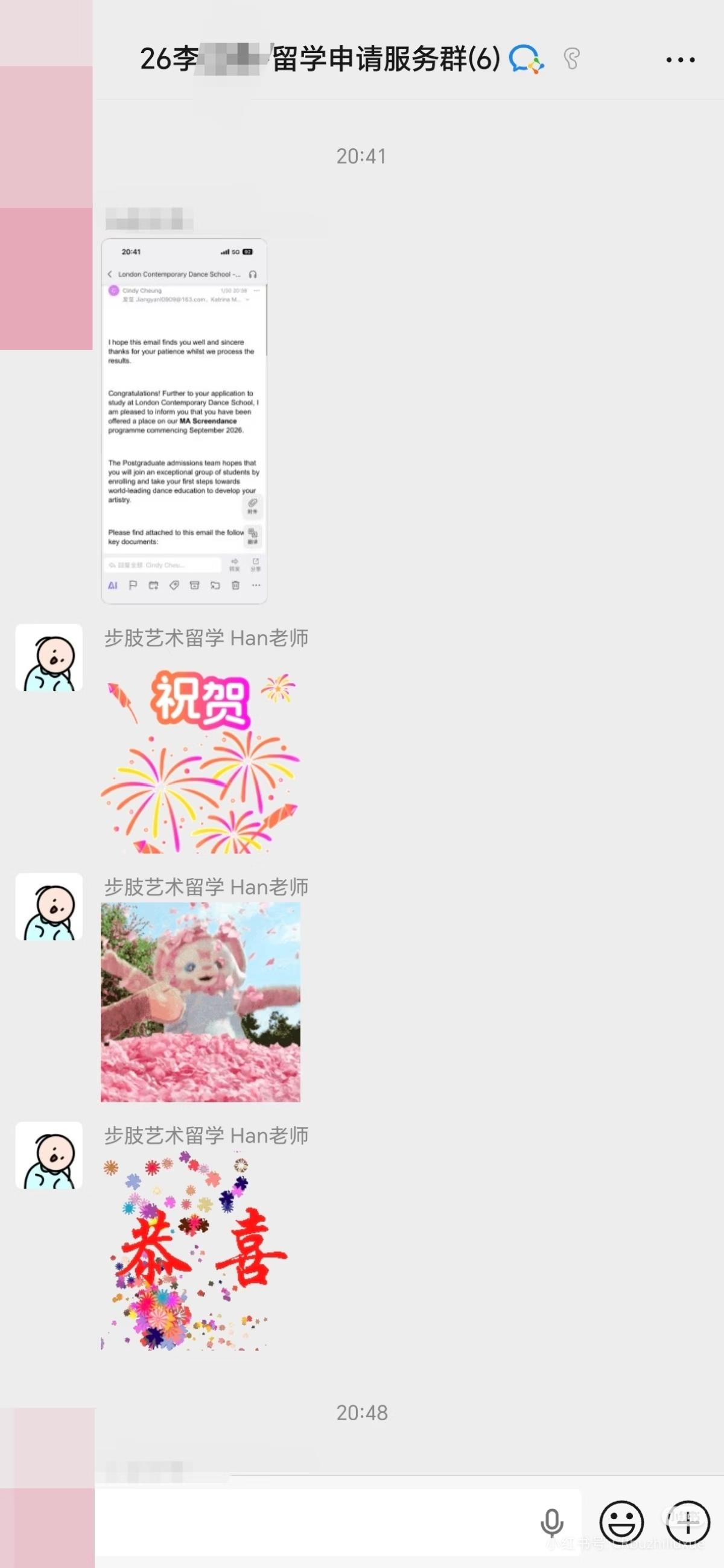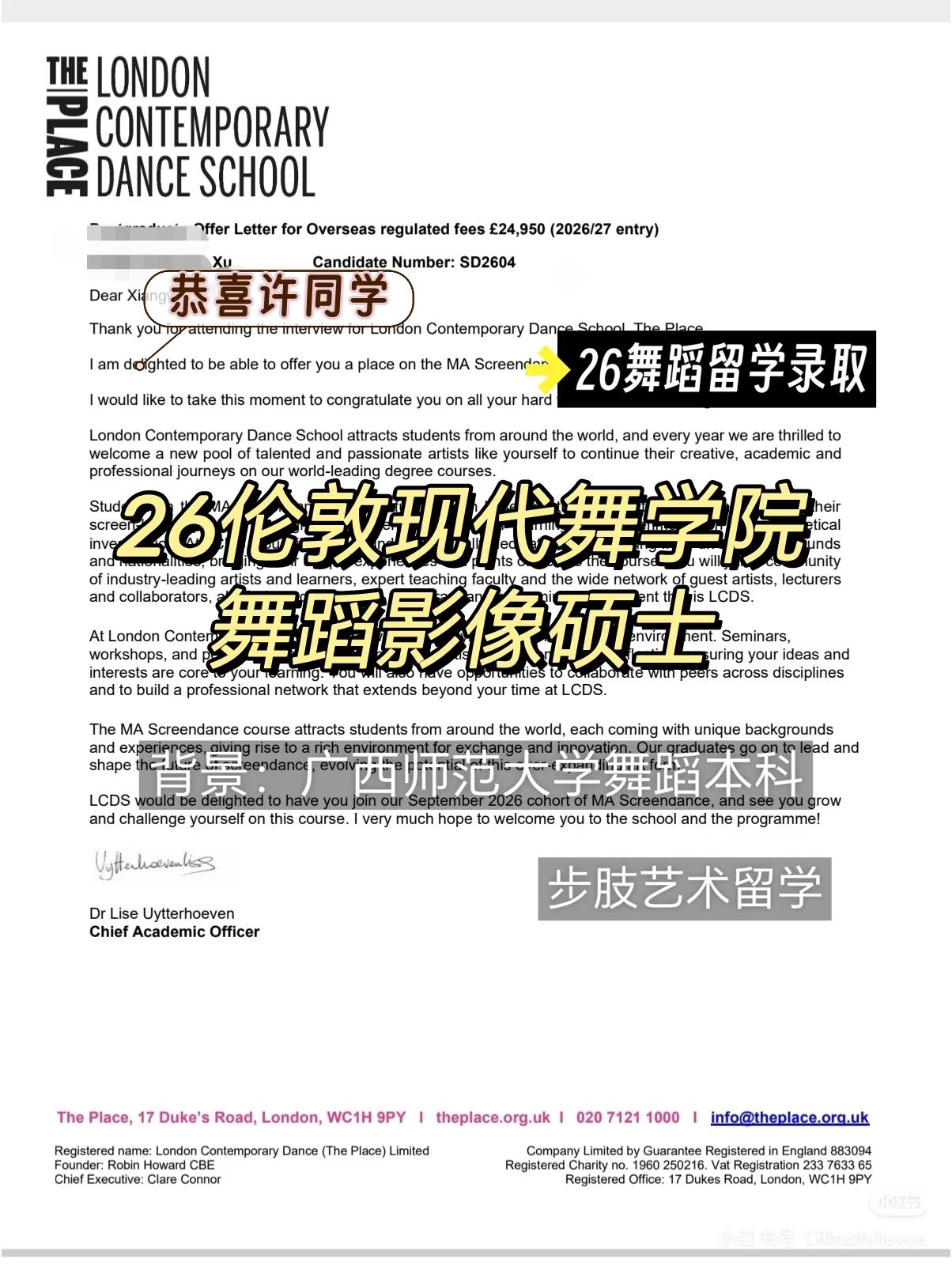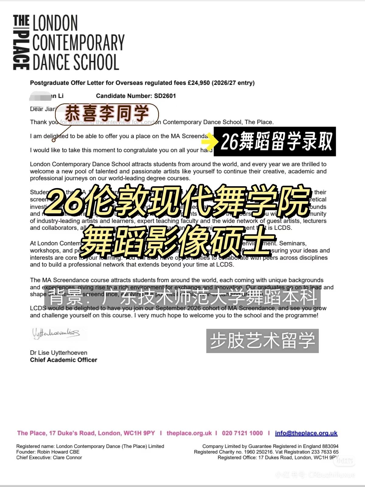 【步肢offer】两份伦现舞蹈影像offer同时到 offer时间:2026.1.30 院校专业:伦敦现代舞学院舞蹈影像硕士 学员背景:1.广西师范大学舞蹈本科,2.广东技术师范大学舞蹈本科 恭喜两位同学