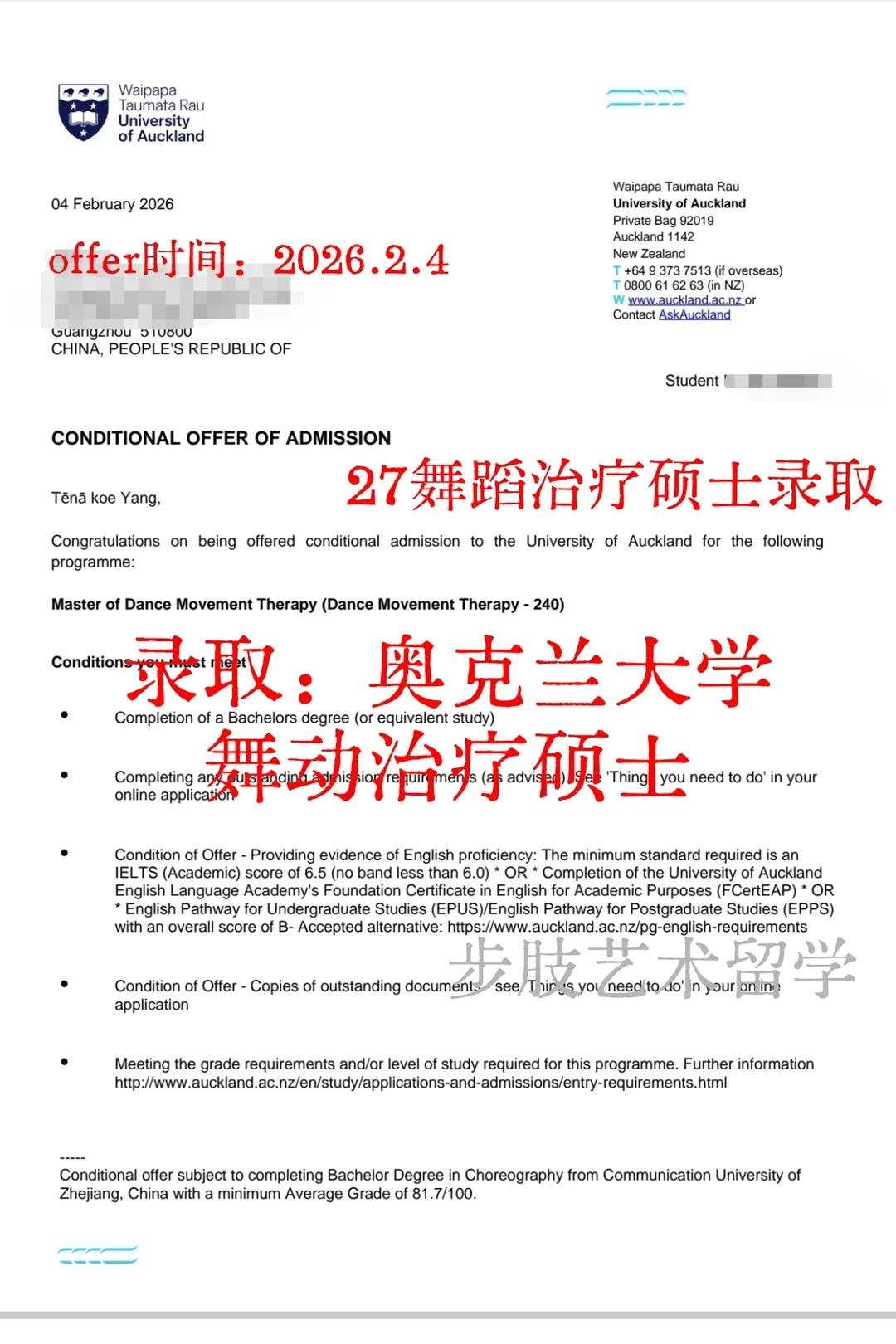 【步肢offer】奥克兰大学舞蹈治疗硕士 offer时间:2026.2.4 院校专业:奥克兰大学舞动治疗硕士 恭喜yang同学