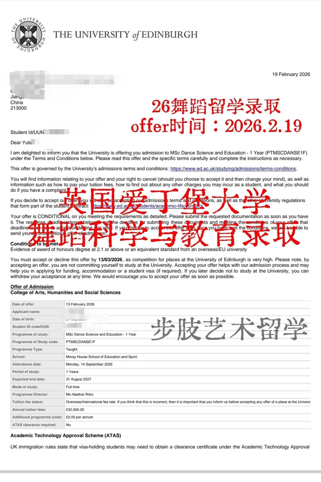 【步肢offer】第22份爱丁堡大学录取 offer时间:2026.220 院校专业:英国爱丁堡大学舞蹈科学与教育硕士 恭喜chen、zhai两位同学