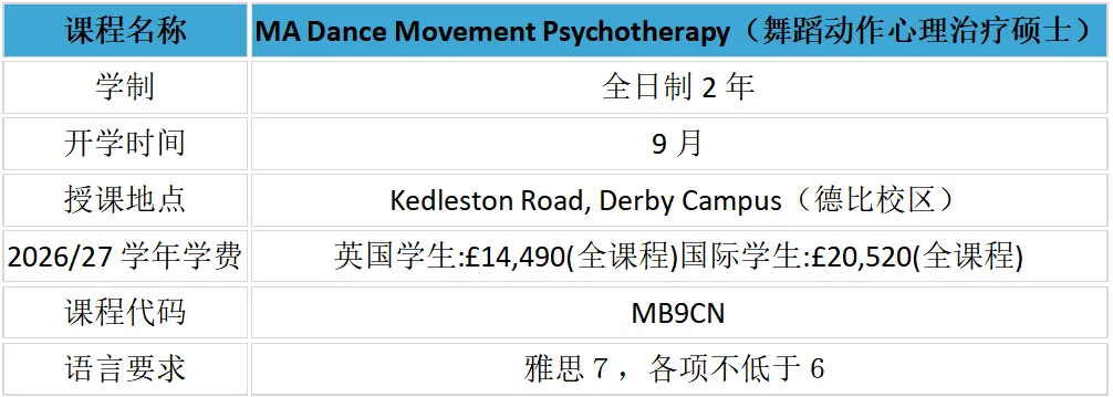 英国德比大学 – 舞蹈动作心理治疗硕士:课程获英国舞蹈动作心理治疗协会(ADMP UK)认可
