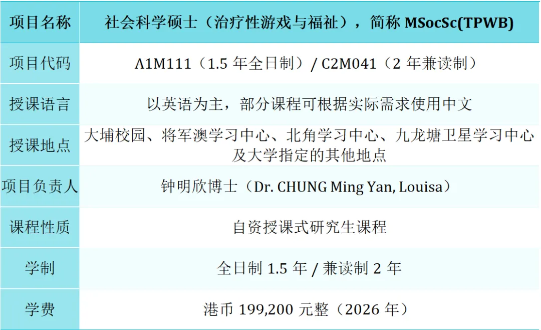 香港教育大学的MSocSc(TPWB)是目前亚太地区少数融合治疗性游戏与整体福祉促进的硕士课程,兼具学术深度与专业实用性。无论您希望转型进入心理辅导领域,还是在现有职业中提升专业技能,该项目都将为您提供坚实的理论基础、国际认证资格与广阔的事业发展平台。
