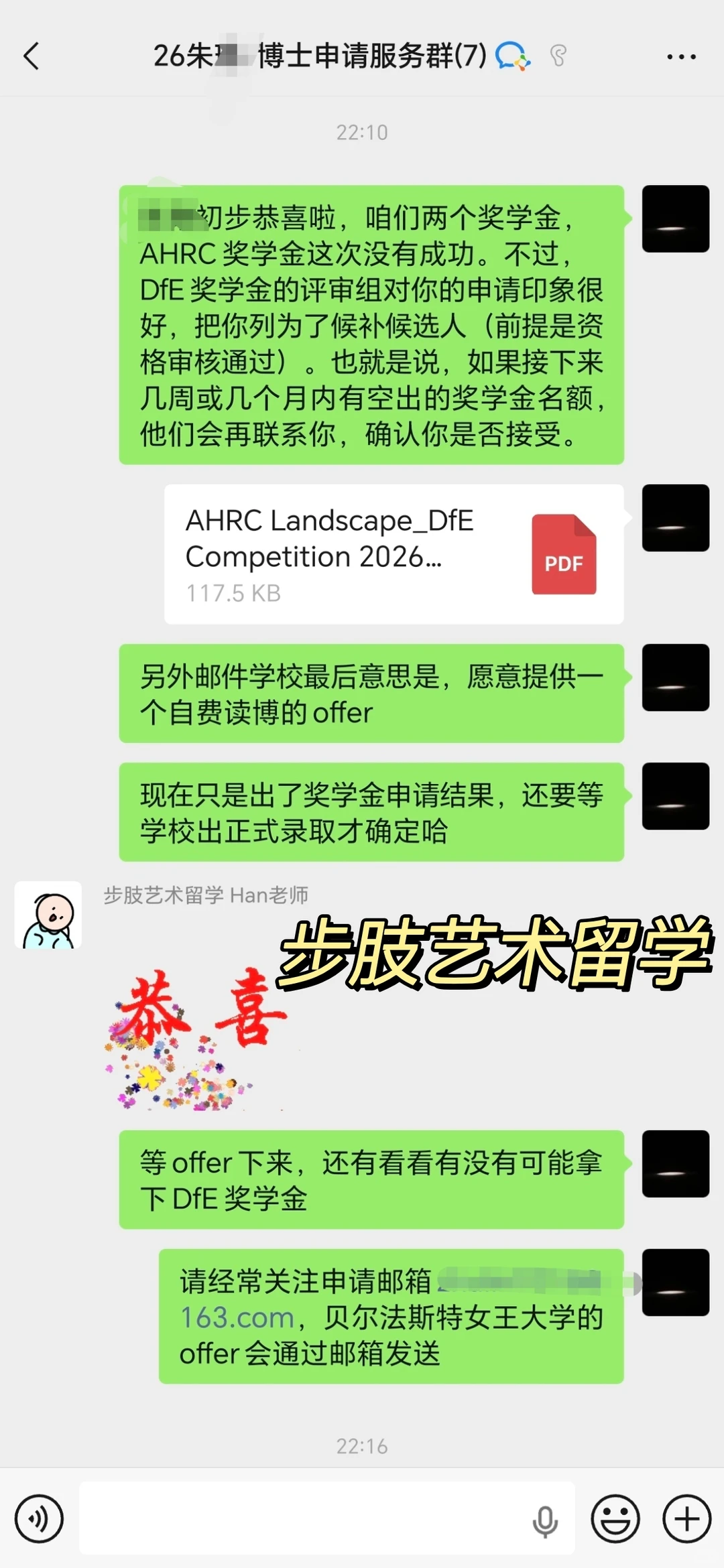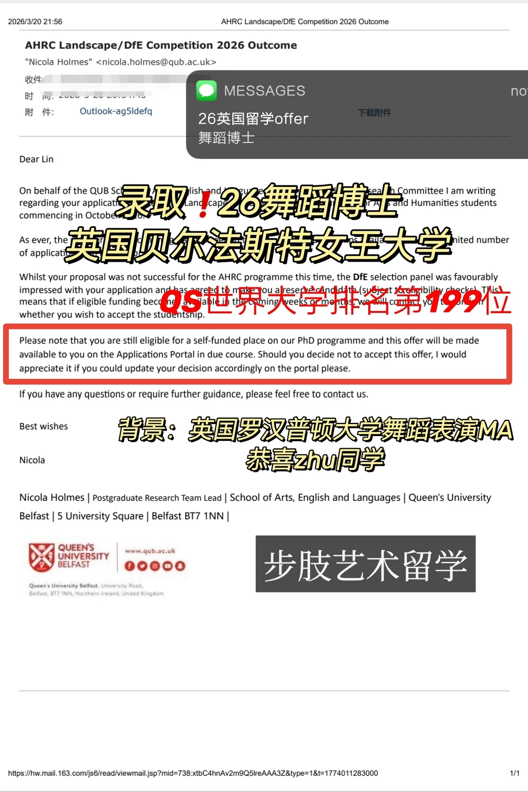 【步肢offer】英国名校舞蹈博士到手 offer时间:2026.3.21 院校专业:英国贝尔法斯特女王大学舞蹈博士,QS199名 学员背景:罗汉普顿大学舞蹈表演MA 恭喜Zhu同学